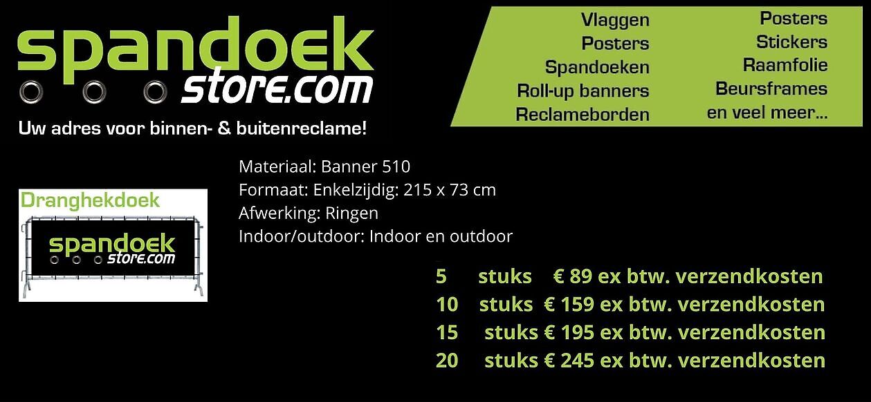 Een dranghekdoek laten bedrukken voor jouw klant? Profiteer van een hoge kwaliteit print door high tech machines van Durst, een scherpe prijs en de snelste levering. Dranghekdoeken zijn een effectief podium voor buitenreclame, zoals locatiemarketing, verkoopondersteuning of bewegwijzering. Met onze standaard formaten kleed jij ieder type hek eenvoudig aan.