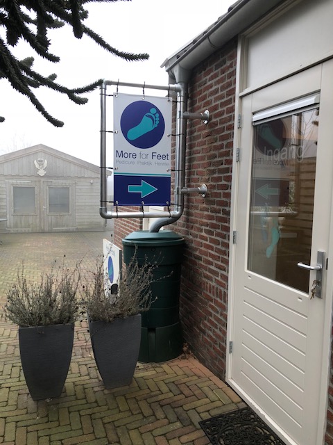 Spandoekframe als reclamebord haaks geplaatst op de muur
